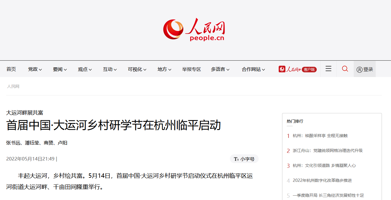 5月14日,人民网刊发《大运河畔展共富首届中国·大运河乡村研学节在杭州临平启动》一文,报道首届中国·大运河乡村研学节启动仪式。关注我校人文学院和临平区新宇村共同发布“农文旅设计与运营”研学课程,打造新宇村红色文化和精品路线,推动大运河文化遗产和运河水乡文化的传播。