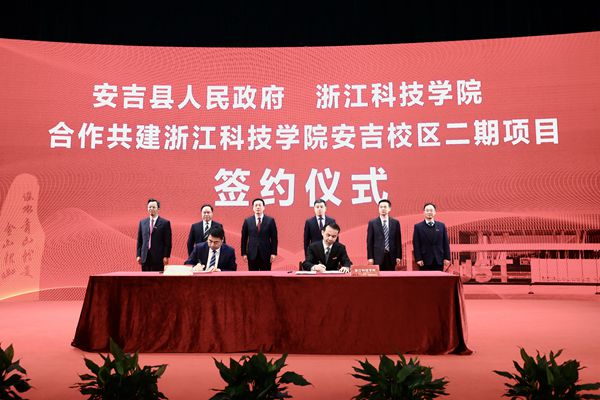 赵东福表示,浙江科技学院始终把服务地方经济社会发展作为重要办学使命。十年来,浙江科技学院努力把安吉校区打造成为国际化办学的“金名片”、服务地方的“桥头堡”、教育改革的“试验田”,各项工作取得良好进展。面对新形势、新使命,合作开展安吉校区二期建设,有利于促进校地双方全面融合和高质量发展,共同创造双向赋能新模式,共同谱写携手共进新篇章。他表示,学校将以此次签约为新起点,强力推进创新深化,打造校地合作新范式;大力推进改革攻坚,打造产教融合科教强校新高地;持续推进开放提升,打造国际合作新篇章,更好服务安吉及湖州绿色化、城市化、国际化发展,将安吉校区打造成为立足安吉、服务湖州、面向长三角的国际化绿色发展创新智谷,在更高起点上为浙江“两个先行”、湖州和安吉“生态文明典范之城”建设及“县域金名片”打造做出新的更大贡献。