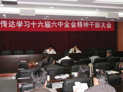 会上,校党委书记徐志平传达了十六届六中全会精神和省委关于学习十六届六中全会精神的有关安排。他指出,建设和谐社会是一项长期的历史性的任务,十六届六中全会精神的学习是今后一个时期学习的重要内容,各单位和部门要高度重视,深刻领会全会的精神和意义。